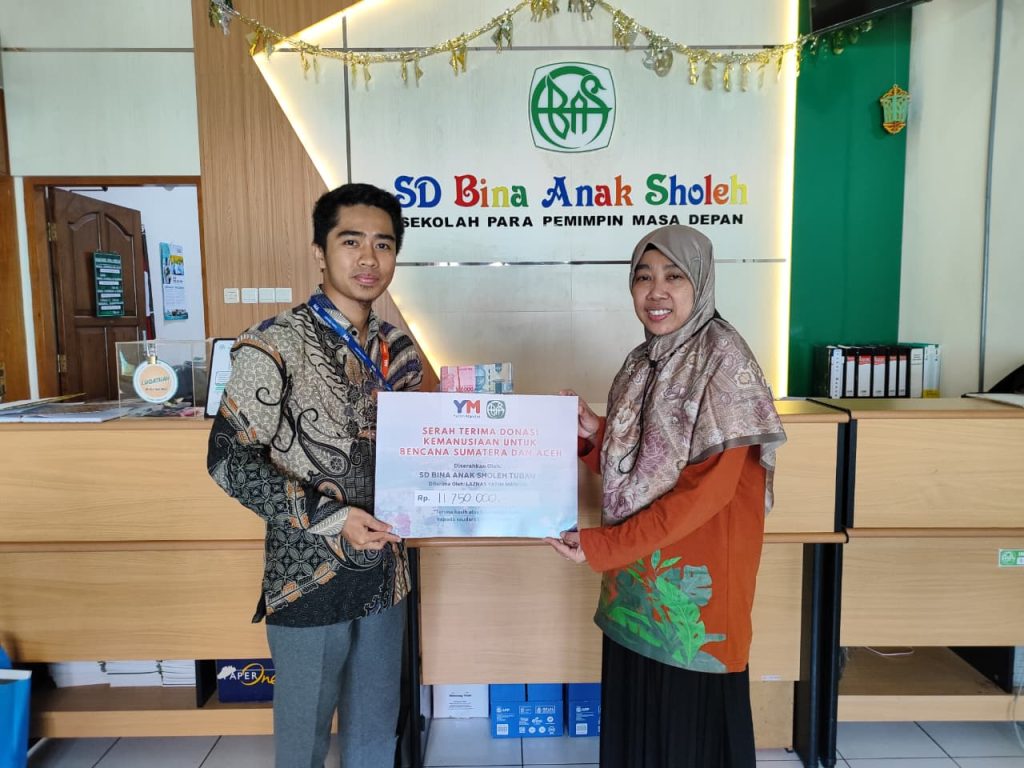 Tuban, YM News – Semangat kepedulian kembali ditunjukkan oleh keluarga besar SD Bina Anak Sholeh Tuban. Pada Jumat (05/12/2025), pihak sekolah resmi menyalurkan donasi kemanusiaan sebesar Rp 11.750.000 (nominal sementara) kepada Yatim Mandiri Tuban untuk membantu masyarakat yang terdampak bencana di wilayah Sumatera.
