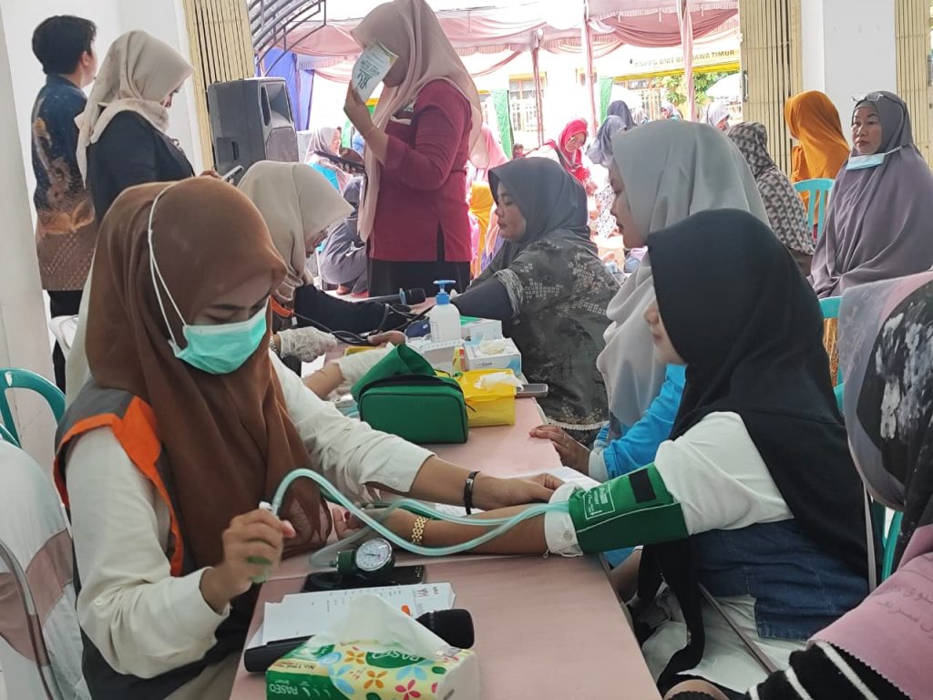 Suasana layanan kesehatan gratis yang meliputi pemeriksaan tekanan darah, asam urat, gula darah, dan kolesterol