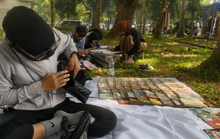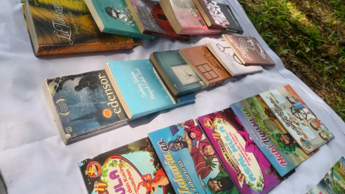 Dengan alas tikar sederhana di bawah pepohonan rindang, para relawan menata puluhan buku dari berbagai genre, mulai dari novel, buku pengembangan diri, hingga bacaan anak-anak. Siapa pun yang datang bebas membaca tanpa dipungut biaya.