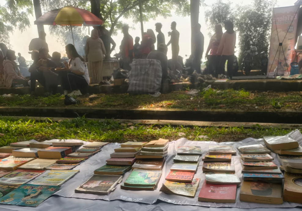 Dengan alas tikar sederhana di bawah pepohonan rindang, para relawan menata puluhan buku dari berbagai genre, mulai dari novel, buku pengembangan diri, hingga bacaan anak-anak. Siapa pun yang datang bebas membaca tanpa dipungut biaya.